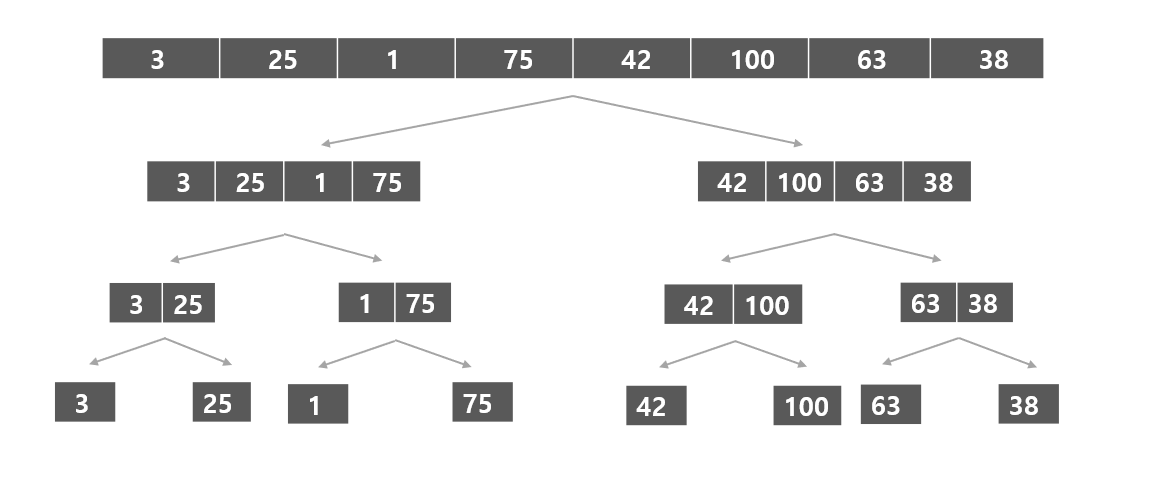 정렬을 하기 위해 임의의 무작위 배열 arr = [3, 25, 1, 75, 42, 100, 63, 38] 이 있다고 하자. 이 배열의 Divide 과정은 아래그림과 같다.