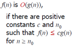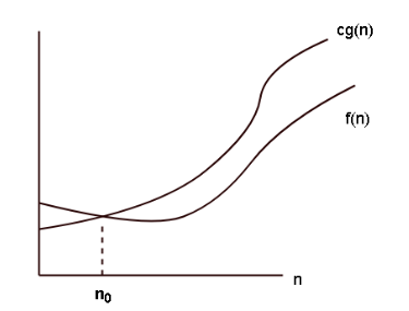 n이 n0 보다 큰 경우에서 어떠한 양의 정수 c를 g(n)에 곱해도 함숫값이 f(n)보다 크거나 같은 경우 함수f(n)의 시간복잡도를 O(g(n))이라고 한다.