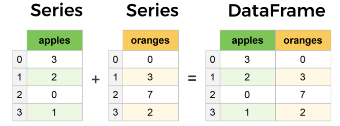 0,1,2,3 과 같은 세로 라벨을 Index라벨, apples, oreanges와 같은 가로 라벨을 Column라벨이라고 한다.